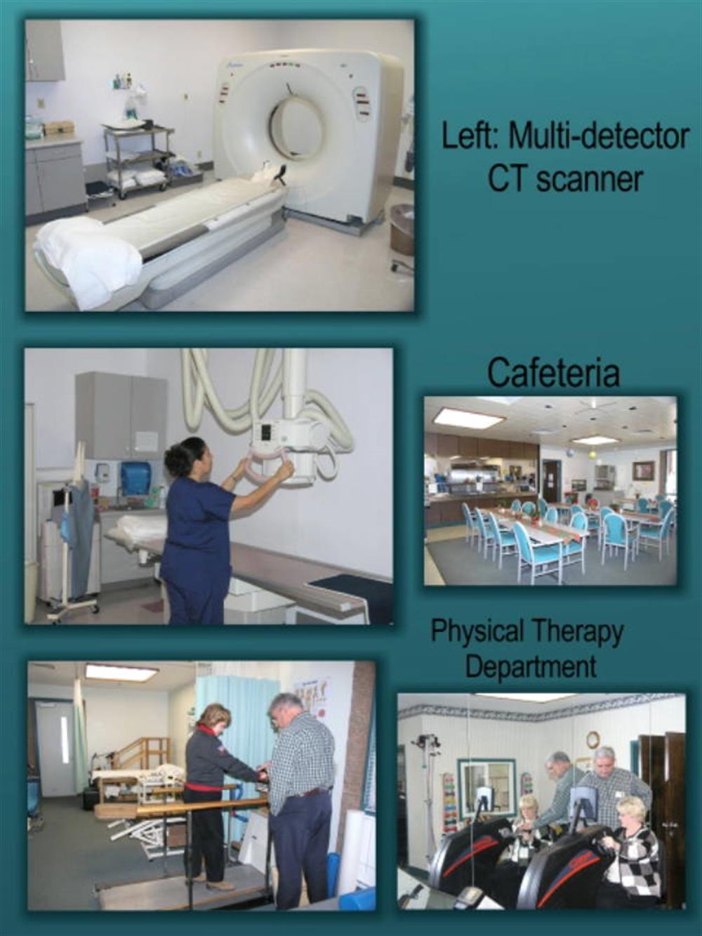 Diagnostic Services include radiological digital imaging, ultrasound, mammography and the multi-detector CT scanner providing the latest technology in high-speed imaging and body scanning. The Laboratory provides testing for ER as well as in and out patients. The Respiratory Therapy Department performs pulmonary function testing, arterial blood gases, EKG’s, treadmills and respiratory treatments. The Physical Therapy Department provides a wide range of therapy for postoperative, post-trauma and rehabilitative patients.