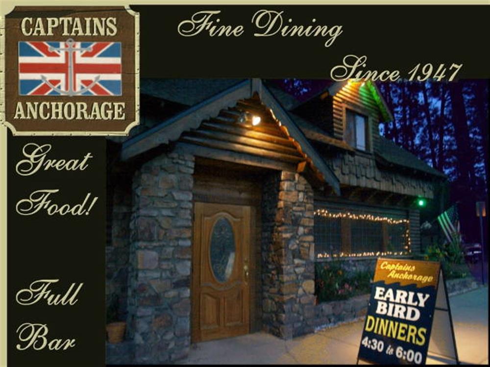 The historic Captains Anchorage Restaurant in Big Bear Lake has been a tradition since 1947. The restaurant is famous for its steak and seafood choices and it now has an Under $20 Menu available –this has replaced their Early Bird Specials.