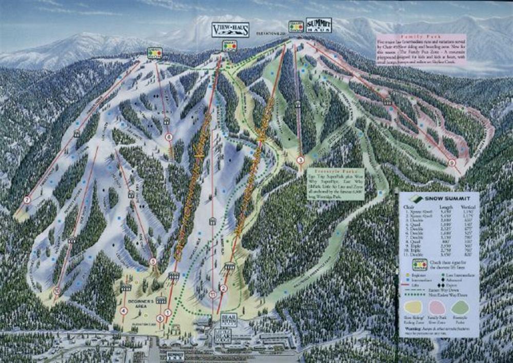 Snow Summit Ski and Snowboard Resort has been the favorite of Southern Californians for nearly five decades. Gentle winding trails - Steep, heart-pounding drops - Long cruising runs - Family fun Zone - Take your pick. For freestyle snowboarders and skiers, our parks are World-famous for their progressive design and constant maintenance. Call 888-SUMMIT-1 for our 24 hr Snow Report.